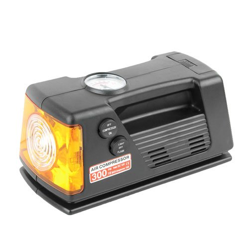 Do the other guys' air compressor prices leave you a little flat? Get this quality 12V DC compressor much less than you'd expect! The portable power you need to inflate everything from air mattresses, bike tires and sports equipment to rafts, boats & vehicle tires! Whether you're at home or on the road, you'll never be without a ready supply of compressed air to keep your world inflated. This compressor plugs into your vehicle's 12V DC socket and delivers up to 300 PSI pressure to get the job done quickly, & it's easy to use, thanks to a 9' power cord, 20 quick connect air hose & adapters. Also features #550 die cast motor for years of use, built-in pressure gauge, accessory storage compartment, built-in work light & emergency flasher. Durable ABS housing is 10-1/2 x 4-1/4 x 5-1/2.