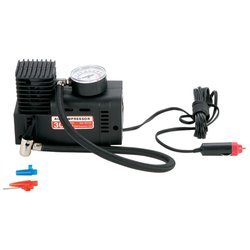 Features air gauge vehicle power source plug 3 nozzle adapters and snap lock air nozzle. Measures 5-3/4" x 2-3/4" x 4-3/8". Clam shell.